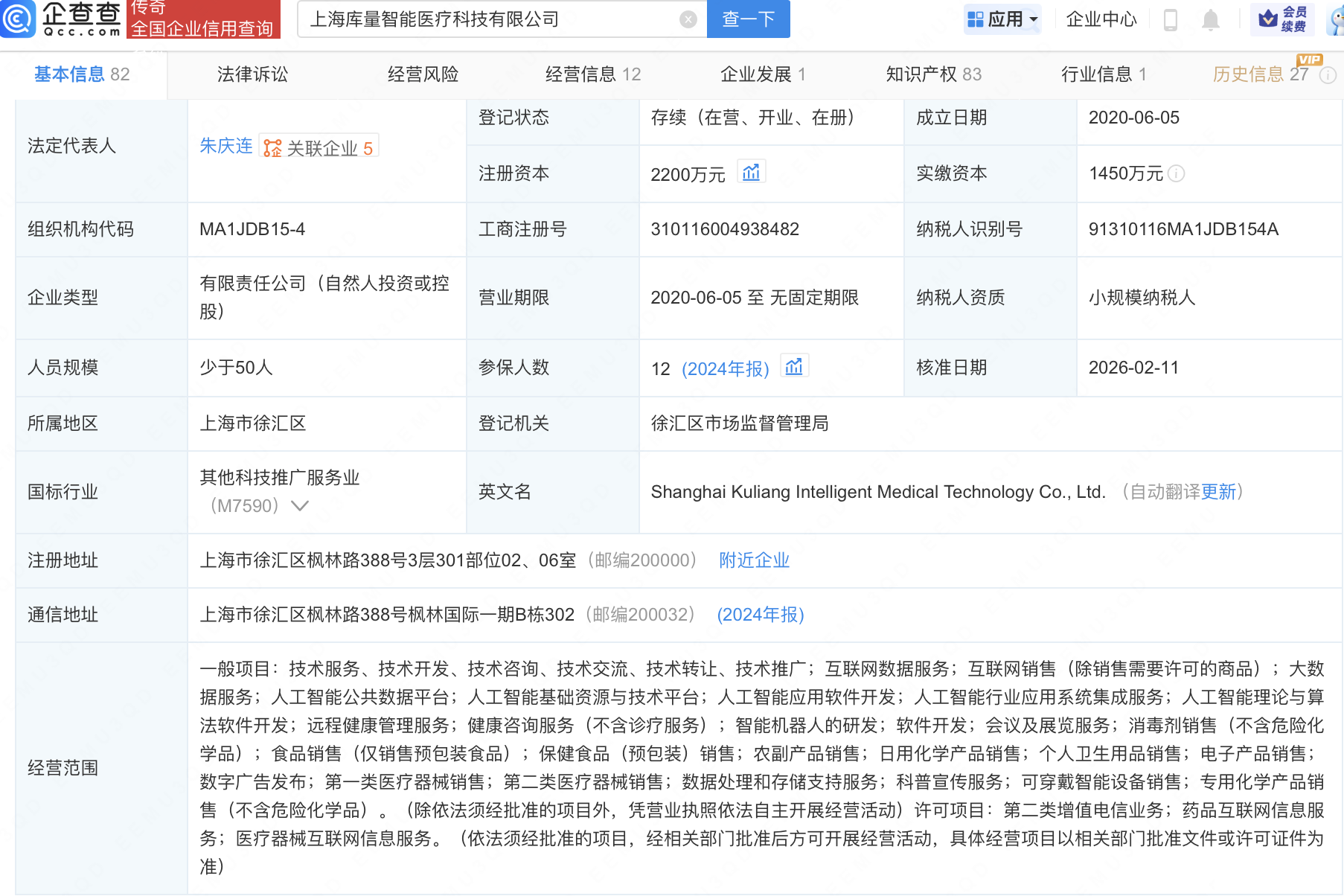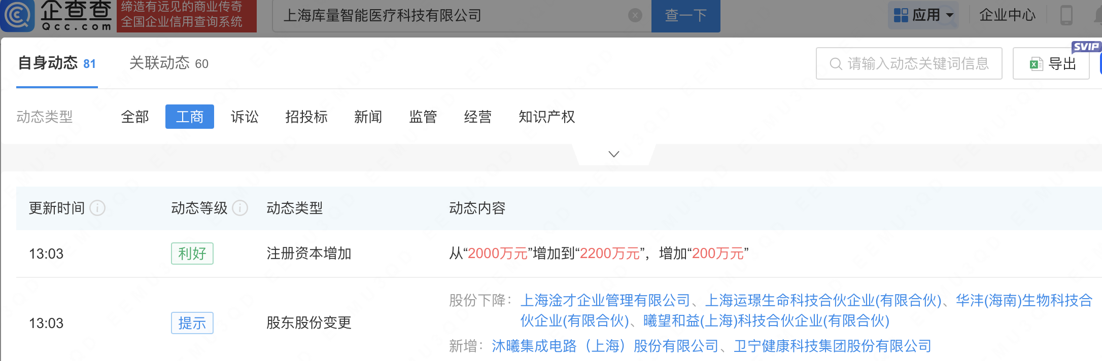 近日,上海库量智能医疗科技有限公司发生工商变更,新增沐曦股份(688802)、卫宁健康(300253)为股东,同时注册资本增至2200万元。企查查信息显示,该公司成立于2020年,经营范围包含:人工智能基础资源与技术平台;人工智能应用软件开发;人工智能行业应用系统集成服务;人工智能理论与算法软件开发等。